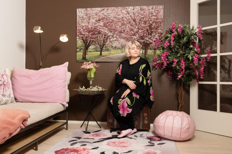 ”Kuvauksiin mennessäni olin vähän hämmentynyt: minkä tyylisissä vaatteissa haluan tulla kuvatuksi? Otin mukaan 60-vuotishippamekkoni. Kai yhteen kuvaan voi ottaa jotain juhlavampaa? Sain kuvauksen syntymäpäivälahjaksi tyttäreltäni,